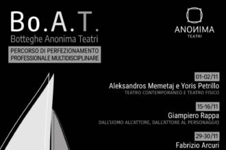 Bo.A.T. – Botteghe Anonima Teatri è un percorso di perfezionamento professionale multidisciplinare dedicato ad attori/attrici e danzatori/danzatrici tra i 20 e i 35 anni a cura di Anonima Teatri, organizzato da Twain nell’ambito del progetto Residenza Artistica sostenuto dal Ministero della Cultura e dalla Regione Lazio. Il corso di alta formazione prevede, dal 1 Novembre 2025 ad Aprile 2026 a Tuscania (VT), 8 weekend di masterclass con con pedagoghi, registi, attori e coreografi di fama nazionale quali Giampiero Rappa, Andrea Pangallo, Fabrizio Arcuri, Ariele Vincenti, Aleksandros Memetaj e Yoris Petrillo.