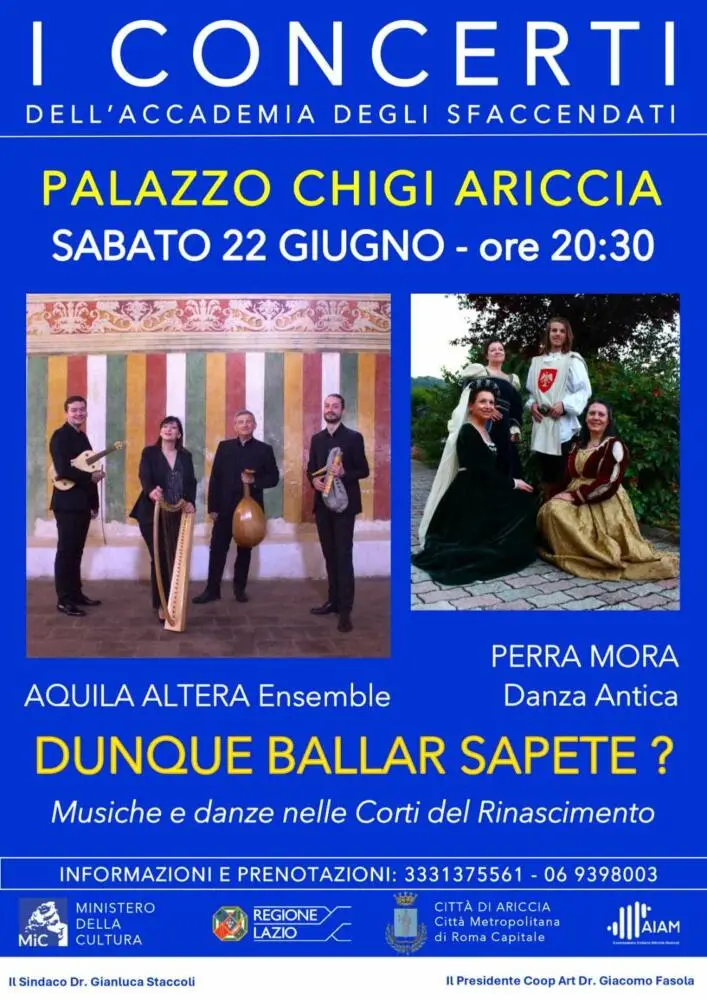 Dunque ballar sapete? è il titolo del concerto/spettacolo che l’ensemble musicale AQUILA ALTERA e il gruppo di danza antica PERRA MORA presenteranno al pubblico de “I Concerti dell’Accademia degli Sfaccendati”. Un itinerario tra musiche e coreografie dell’epoca in cui nasce la figura del Maestro di Ballo e, con il diffondersi della pratica della danza, fiorisce la produzione di Trattati di Danza.