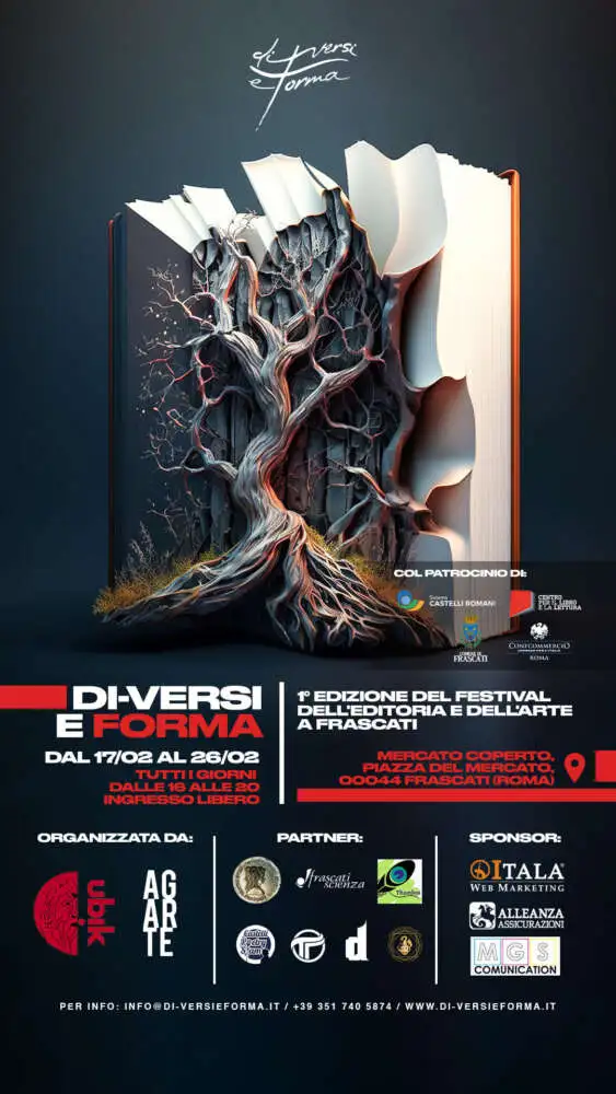 Dal 17/02/2023 al 26/02/2023 presso i locali del Mercato Coperto si svolgerà la 1° Edizione del Festival annuale dell’Editoria e dell’Arte a Frascati “Di-Versi e Forma: Editoria ed Arte a Frascati“, organizzata dall’Associazione Agarte – Fucina delle Arti e UBIK Libreria Frascati, con il patrocinio del Comune di Frascati, dalla Confcommercio di Roma, dal CEPELL e dal Sistema Bibliotecario Castelli Romani.