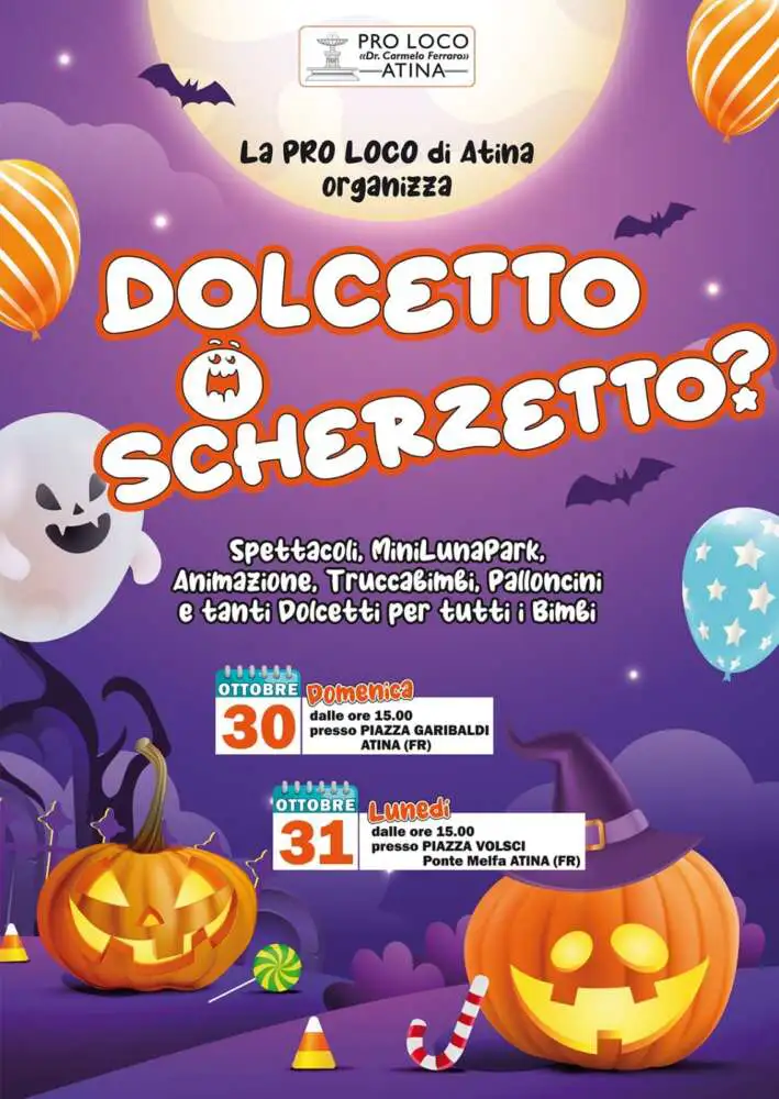 Domenica 30 e 31 Lunedì 2022, per Halloween, ad Atina dalle ore 15:00 appuntamento ad Atina (Fr) con l’evento “Dolcetto o Scherzetto” organizzato dalla Pro Loco.