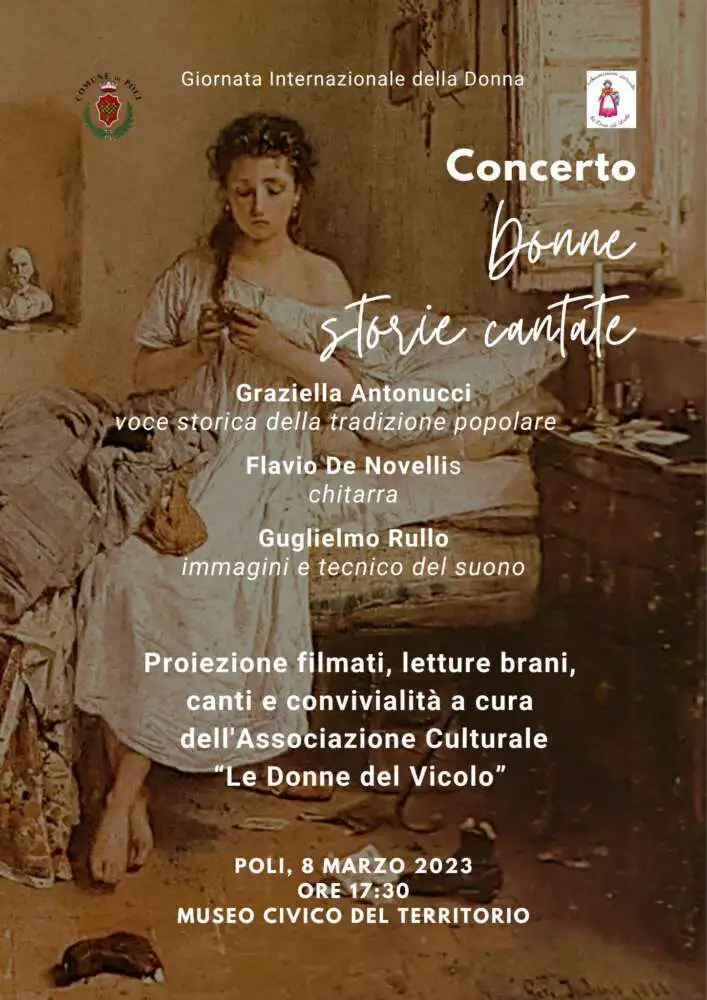 L’Associazione culturale “Le Donne del Vicolo”, in collaborazione con il Comune di Poli, celebra la Festa della Donna con il concerto “Donne storie cantate”, che si terrà mercoledì prossimo 8 marzo presso il Museo Civico del Territorio.