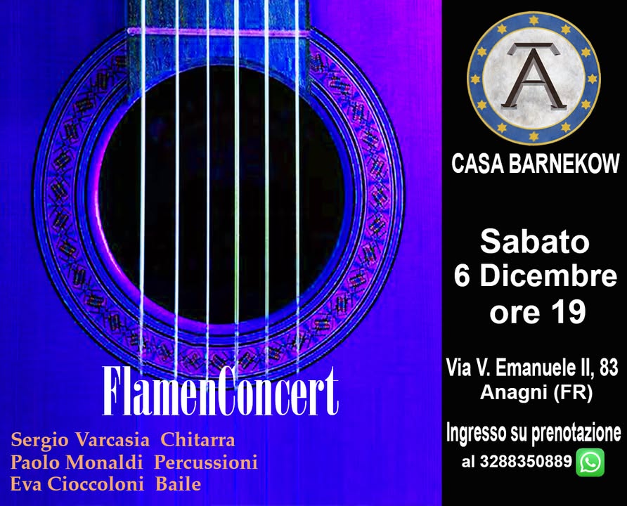 Sabato 6 dicembre, alle ore 19:00, apriamo le porte a una serata dedicata al flamenco, con tre straordinari interpreti: Sergio Varcasia alla chitarra, Paolo Monaldi alle percussioni, e la splendida Eva Cioccoloni al baile. Un evento che gli amanti del genere non potranno perdere, ma anche un’occasione per conoscere questa danza spagnola grazie a degli artisti di eccezione.
