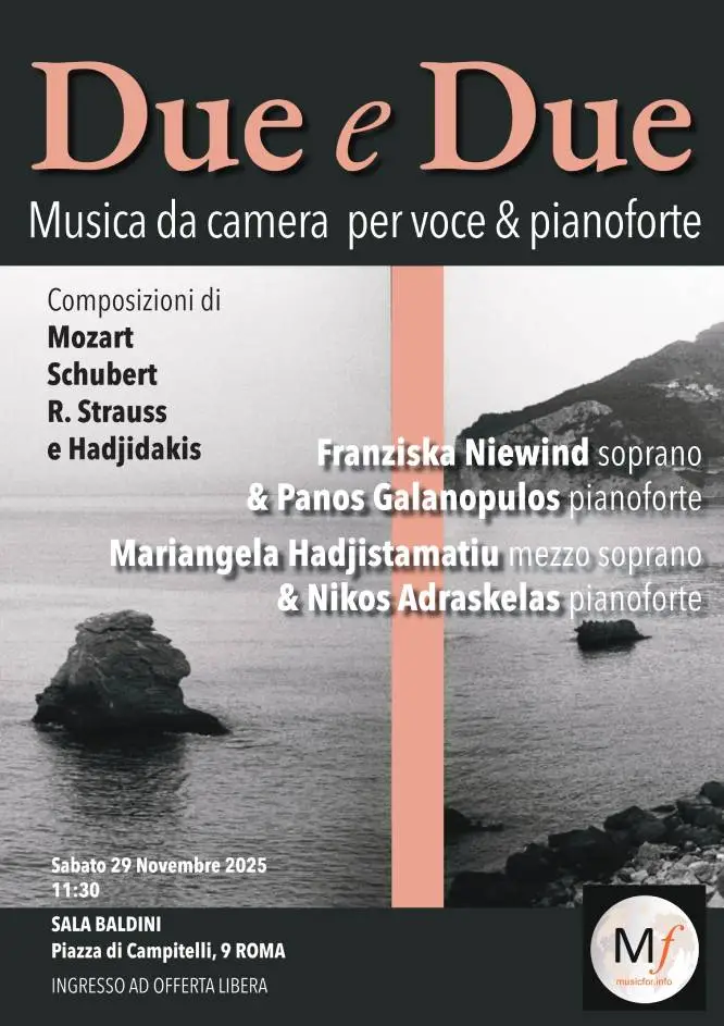Nel concerto “Due e Due”, la soprano tedesca Franziska Niewind, accompagnata al pianoforte da Panos Galanopulos, aprirà la serata con un raffinato programma dedicato al repertorio liederistico tedesco. Le loro interpretazioni di Mozart, Schubert e Richard Strauss offriranno al pubblico un viaggio sonoro tra eleganza, lirismo e profondità emotiva. Nella seconda parte, la mezzosoprano Mariangela Hadjistamatiu e il pianista Nikos Adraskelas presenteranno [...]...