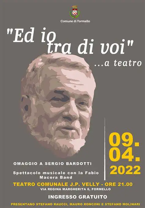 “E io tra di voi… A teatro” sarà un viaggio nella storia della musica italiana, nel quale riascolteremo grandi successi come “Occhi di ragazza”, “Ti lascerò”, “Piazza Grande”, “Quella carezza della Sera” ed altri capolavori scritti da Bardotti e suonati dal vivo dal maestro Fabio Macera e dalla sua band di ottimi musicisti.