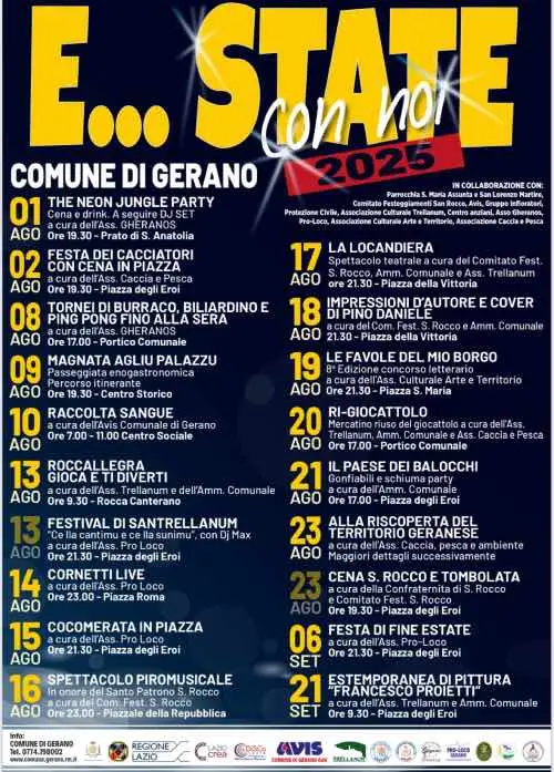 Anche quest’anno il Comune di Gerano ti invita a trascorrere un’estate indimenticabile tra musica e spettacoli: con DJ set e serate danzanti, giochi, tornei e animazione per tutte le età, degustazioni e passeggiate enogastronomiche, spettacoli teatrali e musicali, concorsi letterari e laboratori.