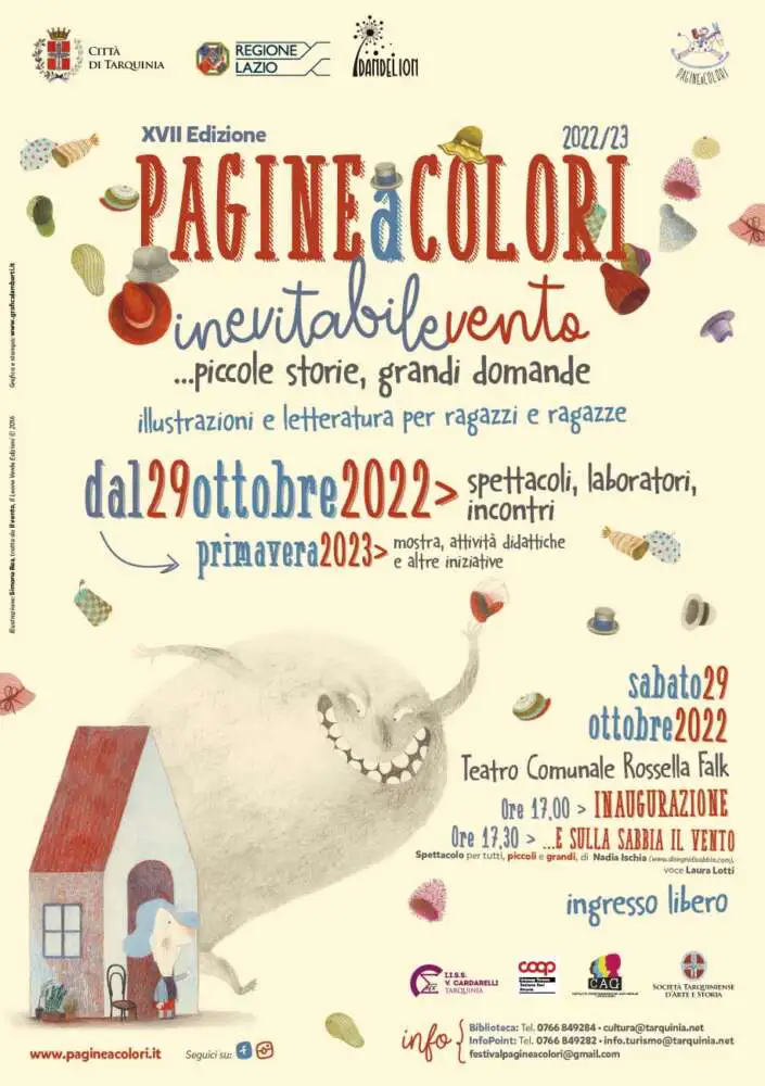 Il festival “PAGINEaCOLORI” è organizzato con il sostegno del Comune di Tarquinia (assessorato alla cultura e biblioteca comunale “Vincenzo Cardarelli”), della Regione Lazio (Laziocrea) e dell’UniCoop Tirreno – Sezione Soci Etruria, in collaborazione con l’associazione di promozione sociale Dandelion, l’IISS “Vincenzo Cardarelli” di Tarquinia, il Centro di aggregazione giovanile (Cag) di Tarquinia e la Società Tarquiniense d’Arte e Storia.