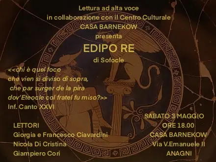 Questo sabato, 3 maggio, alle ore 18:00, è in scena a Casa Barnekow – Anagni, una versione molto particolare dell’Edipo Re di Sofocle, fra lettura e narrazione. A cura appunto del gruppo “Lettura ad alta voce”, l’allestimento di una delle più famose tragedie greche vede in scena degli appassionati lettori (Giorgia Ciavardini, Francesco Ciavardini, Nicola Di Cristina, Giampiero Cori) che trasmetteranno al pubblico tutto il loro coinvolgimento e la loro emozione nel dare consistenza ai questi versi immortali.