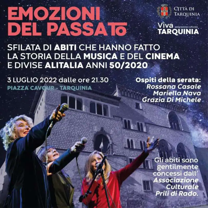 Una serata di moda e musica organizzata dall’associazione culturale Viva Tarquinia, con il sostegno del Comune di Tarquinia e della Coldwell Banker FRG & Partners, filiale di Tarquinia. Nella splendida cornice di piazza Cavour, tra il teatro “Rossella Falk” e palazzo Vitelleschi, il 3 luglio, dalle 21,30, si terrà la seconda edizione di “Emozioni dal passato”, la sfilata di moda degli abiti che hanno fatto la storia della musica e del cinema della collezione dell’associazione Roberto Prili Di Rado, con la partecipazione straordinaria delle cantautrici Rosanna Casale, Grazia Di Michele e Mariella Nava