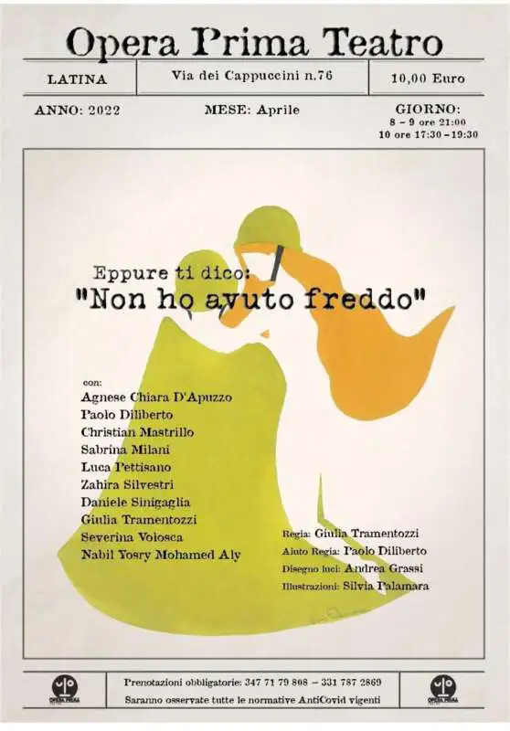 Lo spettacolo verrà rappresentato ad opera prima teatro Via dei Cappuccini 76 per info e prenotazioni 3317872869-3477179808 nei seguenti giorni: