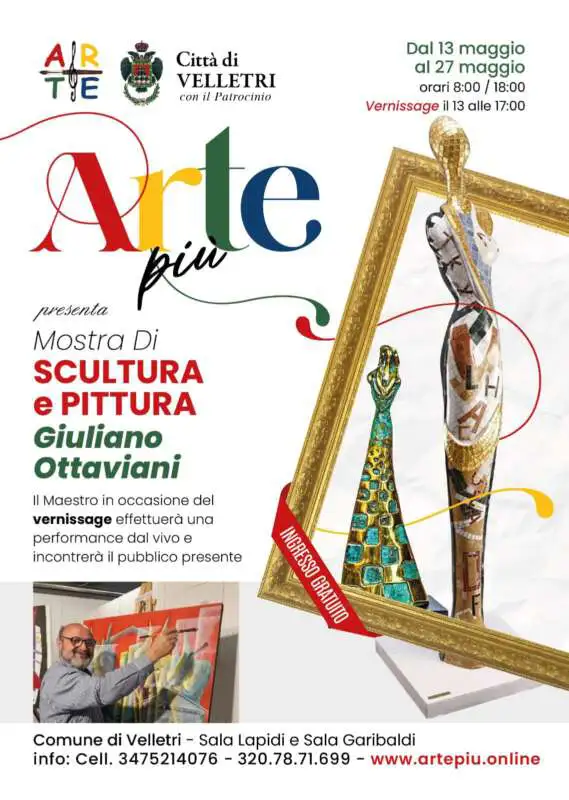 Dal 13 al 27 Maggio 2022, negli orari dal lunedì al venerdì, dalle ore 8.00 alle 18.00, avrà luogo l’esposizione del Maestro Giuliano Ottaviani organizzata dall’ associazione culturale “Arte Più” presso le sale Garibaldi e Le Lapidi del palazzo comunale veliterno.