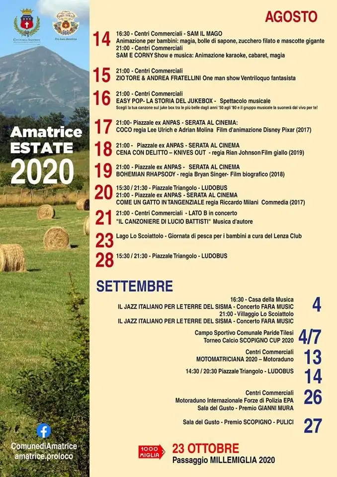 Il programma degli eventi dell'estate ad Amatrice. ECCO IL PROGRAMMA DELLE MANIFESTAZIONI ESTIVE! Tutte le iniziative e gli eventi in calendario si svolgeranno nel pieno rispetto delle disposizioni anti covid-19...