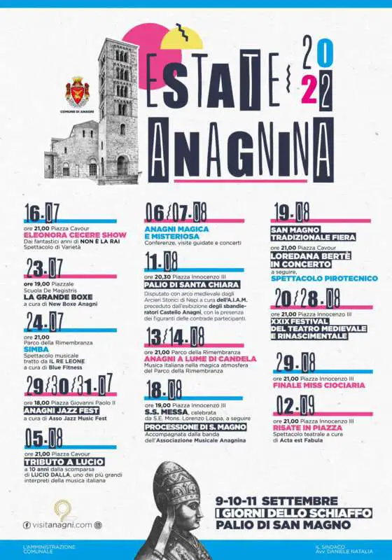 Il 9, 10 ed 11 settembre si chiude l’estate anagnina 2022 con “I giorni dello schiaffo” ed il Palio di San Magno, tradizionale competizione cavalleresca basata sulla “giostra dell’anello”, con la presenza anche dei figuranti in costume storico medievale delle contrade cittadine.