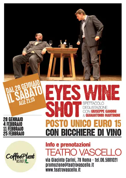 Giuseppe Gandini e Gianantonio Martinoni sono due attori ferraresi che vivono a Roma da più di venti anni. Si conoscono dalla prima media e sono stati, sin dall’adolescenza, ottimi bevitori, non particolarmente esperti. Entrambi lavorano come professionisti al cinema, in televisione e in teatro: Eyes Wine Shot ha permesso loro di tornare a lavorare insieme dopo 15 anni. Sarà stato un bene?