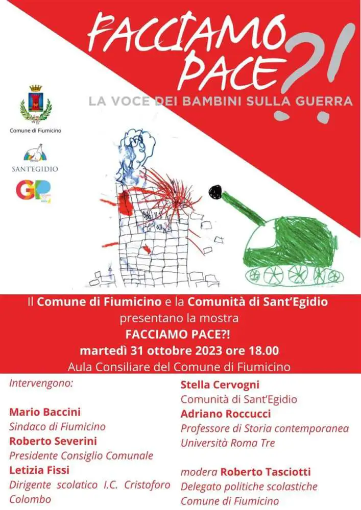 Il 31 ottobre, alle ore 18, presso l’Aula Consiliare del Comune di Fiumicino, verrà inaugurata la mostra “Facciamo Pace?!” organizzata dal Comune di Fiumicino, in collaborazione con la Comunità di Sant’ Egidio.