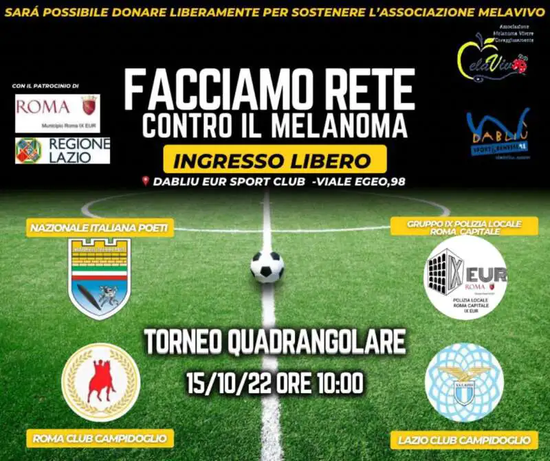 Sabato 15 ottobre, con inizio alle ore 10, presso l’impianto sportivo Dabliu Eur Sport Club di viale Egeo 98, andrà in scena il quadrangolare di calcio solidale tra le formazioni della Nazionale Italiana Poeti, il IX Gruppo di Polizia Locale di Roma Capitale e i Roma e Lazio Club Campidoglio.