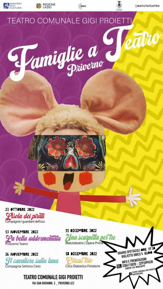 Torna anche quest’anno, presso il Teatro Comunale Gigi Proietti di Priverno, “Famiglie a teatro”, la rassegna di teatro ragazzi promossa e sostenuta da A.T.C.L., il Circuito Multidisciplinare di promozione, distribuzione e formazione del pubblico per lo spettacolo dal vivo nella Regione Lazio, in collaborazione con Comune di Priverno e Matutateatro Officina Culturale dei Monti Lepini della Regione Lazio.