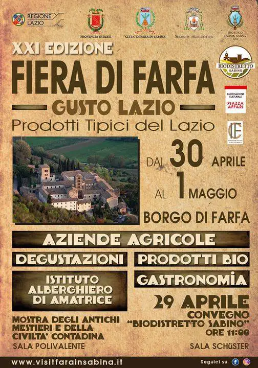 Il Comune di Fara in Sabina, con il patrocinio della Provincia e dell’Arsial, organizzerà la XXI^ edizione della “FIERA DI FARFA” – GUSTO LAZIO nell’omonimo borgo, per i giorni Domenica 30 Aprile e Lunedì 1° Maggio 2023.