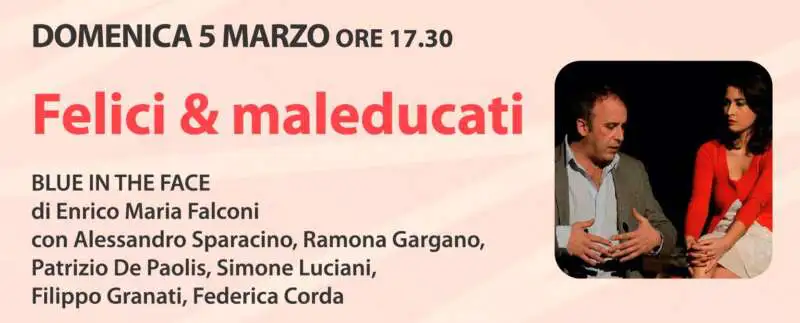 Domenica 5 marzo alle 17,30, il Teatro Boni di Acquapendente porta sul palco, per la stagione di prosa 2022/2023, “Felici & maleducati”, lo spettacolo scritto e diretto da Enrico Maria Falconi della compagnia Blue in the face con Alessandro Sparacino, Ramona Gargano, Patrizio De Paolis, Simone Luciani, Filippo Granati e Federica Corda.