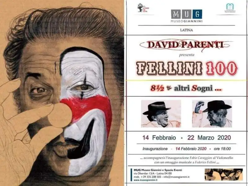 Venerdì 14 febbraio sarà inaugurata al MUG Museo Giannini di Latina la mostra Fellini 100 – 8 1/2 & altri Sogni… durante la quale saranno esposti disegni e dipinti che David Patenti ha dedicato al regista riminese, ai suoi film e al suo alter ego cinematografico Marcello Mastroianni: matita e tecniche miste su foglio, cartone e legno e grandi serigrafie su tela plastificata.
