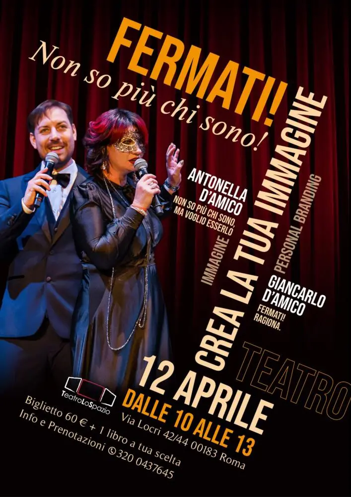 Sabato 12 aprile presso il Teatro Lo Spazio di Roma, sito in via Locri 42/44, dalle ore 10:00 alle 13:00, andrà in scena uno spettacolo che coniuga intrattenimento, formazione e crescita personale. “Fermati! Non so più chi sono!” è il titolo dell’evento che vedrà salire sul palco due esperti, apprezzati nel campo della bellezza, della comunicazione e del buisness: Giancarlo e Antonella D’Amico.