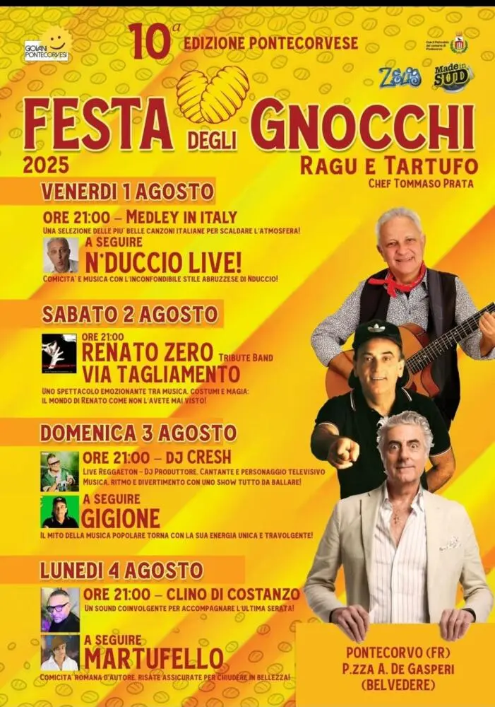 Preparati a vivere la sagra più esplosiva dell’estate: dal 1° al 4 agosto 2025, Pontecorvo (FR) diventa l’epicentro del divertimento con la 10ª edizione della FESTA DEGLI GNOCCHI – Ragù & Tartufo Edition. Non una semplice sagra, ma un evento che spacca: gnocchi fumanti, ospiti da urlo, e serate che promettono di far tremare il Belvedere!