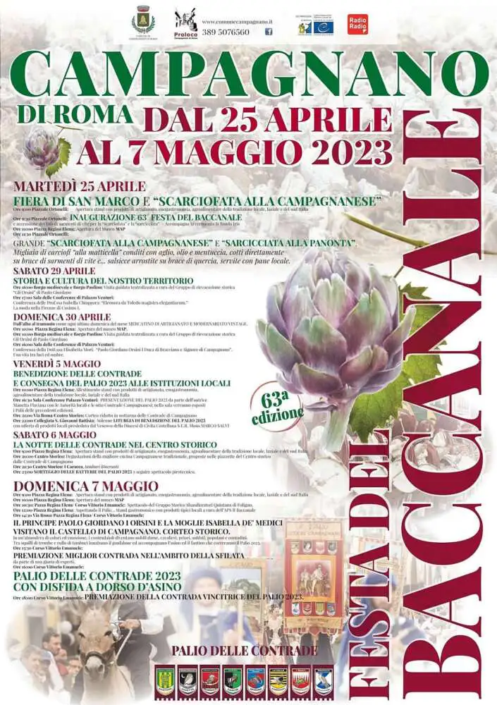 Un calendario di appuntamenti ricchissimo per la Festa Baccanale 2023 che si svolgerà dal 25 aprile al 7 maggio, organizzata dal Comune di Campagnano di Roma in collaborazione con la Proloco, l’Aps Baccanale, le Contrade di Campagnano e l’Associazionismo Locale!