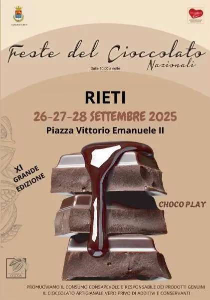 Per l’undicesimo anno consecutivo, con il patrocinio del Comune, ritorna a Rieti in Piazza Vittorio Emanuele II, da venerdì 26 a domenica 28 Settembre 2025, la grande Festa del Cioccolato Artigianale!