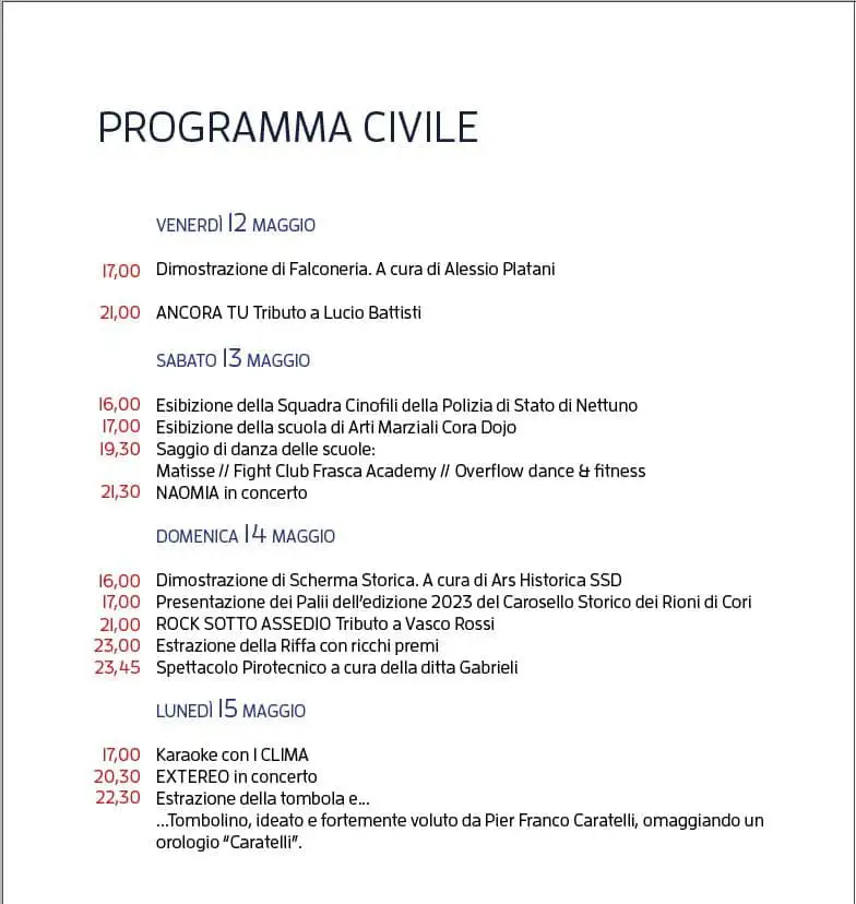 Quest’anno 2023, la festa si terrà nei giorni 12, 13, 14 e 15 maggio.