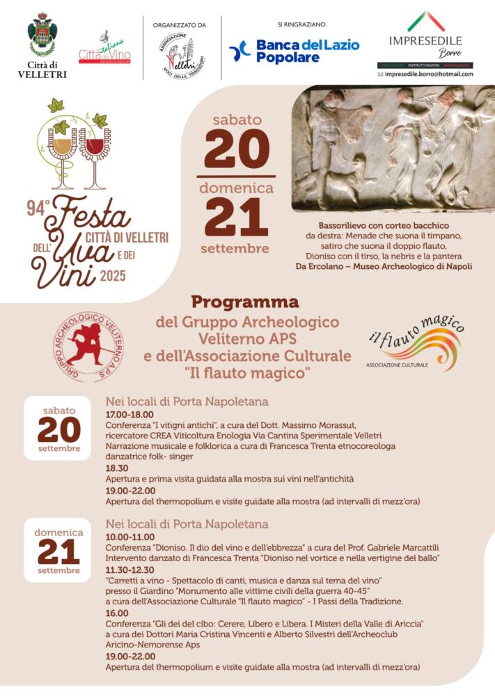 Nei giorni 20 e 21 settembre, a Velletri si svolgerà la 94esima edizione della Festa dell’Uva e dei Vini. La manifestazione è organizzata dal Comune di Velletri, che si è affidato all’associazione Voci delle Tradizioni, con il patrocinio della Regione Lazio e dell’Arsial.