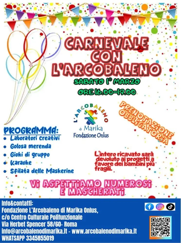Festa di Carnevale organizzata dalla Fondazione l’Arcobaleno di Marika per grandi e piccini, l’evento si svolgere in un’armonia piena di laboratori , giochi, Karaoke un ricco buffet e per finire sfilata e premiazione della maschera più bella. I fondi raccolti verranno destinati a progetti a sostegno dei minori in difficoltà appartenenti a famiglie con disagio socio economico.
