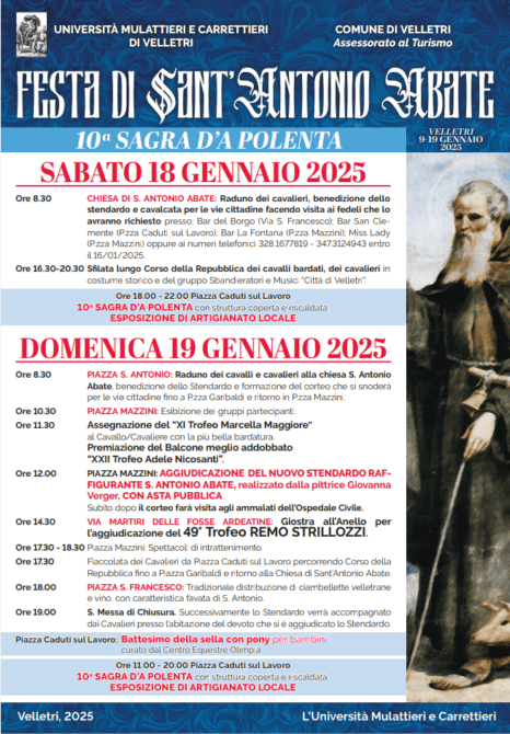 Per i buongustai alle ore 18.00 in piazza San Francesco sarà possibile degustare un’eccellente zuppa di fave, accompagnata da un favoloso vino locale e da squisitissime ciambelle Velletrane. Nella serata di sabato 18 e per tutta la giornata di Domenica 19 Gennaio presso Piazza caduti sul Lavoro si svolgerà la decima edizione della Sagra della polenta in struttura coperta e riscaldata. Per la gioia dei più piccoli anche quest’anno si svolgerà il battesimo della sella con pony (gratuito) per bambini e ragazzi, curato dal Centro Equestre Olimpia. Inoltre sulla suddetta piazza sarà presente anche una interessantissima esposizione di artigianato locale. Alle ore 19 circa lo stendardo verrà portato presso l’abitazione dell’aggiudicatario dell’asta dove dimorerà per un anno.
