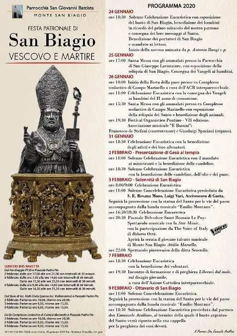 Lunedì 3 febbraio, solennità di San Biagio, le Messe saranno alle 8.00, 9.00, 11.00, 16.30 e 18.30. La Messa delle 11.00 sarà presieduta dall’arcivescovo di Gaeta Luigi Vari. Seguirà la processione con la banda musicale “Emilio Montano”. Alle 20.30 in piazzale Belvedere (via Roma) si terrà lo spettacolo di Roberta Orrù artista di The Voice of Italy – Star Music. Aprirà la serata Attilio Marsella, giovane talento musicale di Monte San Biagio. Alle 22.00 spettacolo pirotecnico della ditta Scarsella.