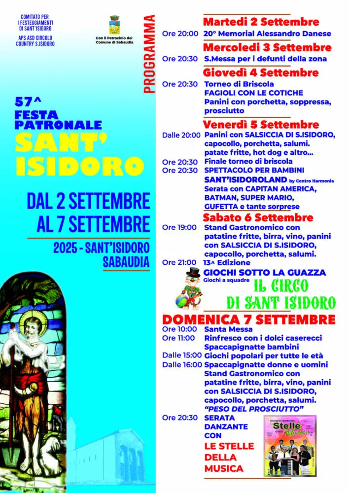Il Comitato per i Festeggiamenti di Sant’Isidoro, in collaborazione con l’APS ASD Circolo Country Sant’Isidoro e con il patrocinio del Comune di Sabaudia, organizza la 57ª edizione della Festa Patronale di Sant’Isidoro, in programma dal 2 al 7 settembre 2025 presso la frazione di Sant’Isidoro.