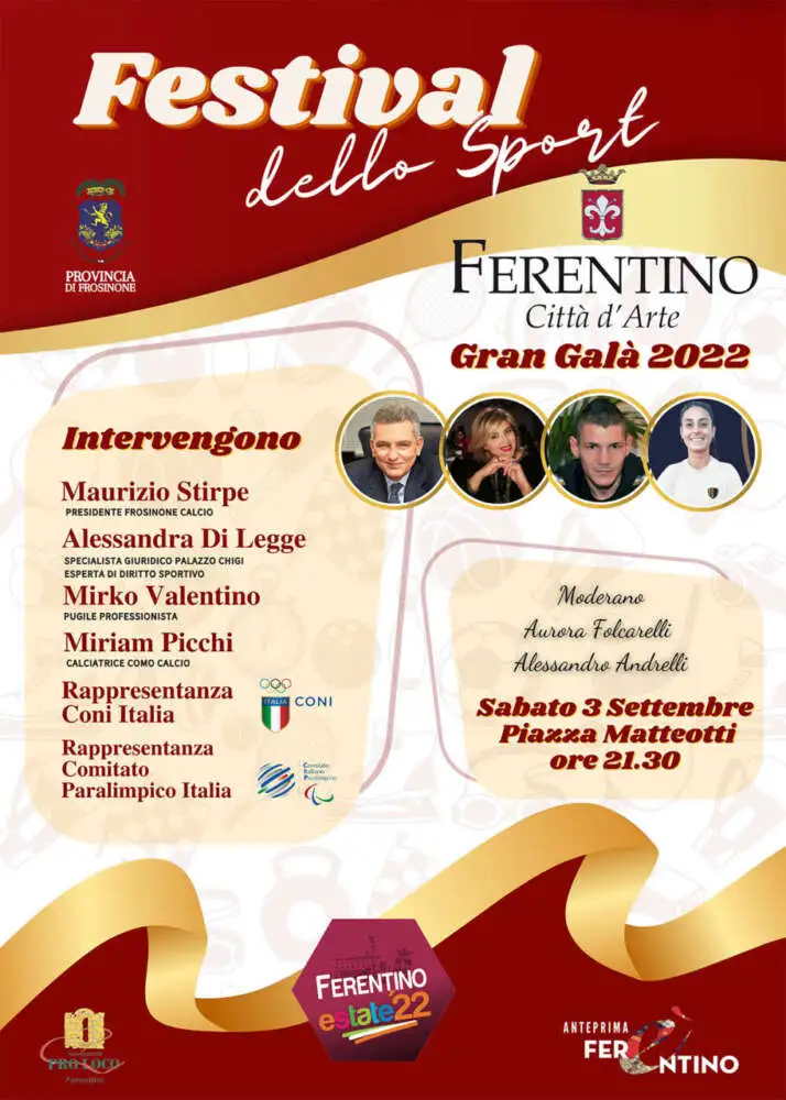Sabato 3 settembre 2022 come anteprima di “Ferentino è” il centro storico di Ferentino si trasformerà, a partire dalle ore 18.00, in un grande villaggio sportivo che si estenderà da viale Marconi a piazza Matteotti, ospitando il Festival dello Sport.