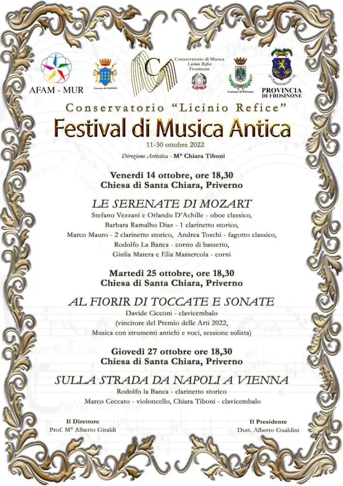 Priverno, i giorni 14-25-27 ottobre 2022, nello splendido scenario dell’ Auditorium Santa Chiara, ospita il Festival di Musica Antica, organizzato dal Conservatorio di Frosinone e il Coordinamento di Musica Antica con il sostegno del MUR AFAM: “Sostegno ai progetti di ricerca e produzione artistica”,