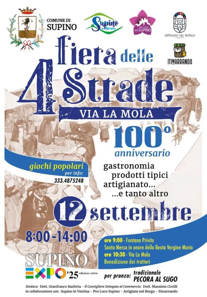 Supino si prepara a celebrare una delle sue tradizioni più sentite: la Fiera delle 4 Strade, in programma il 12 settembre 2025, dalle ore 8:00 alle 14:00. Quest’anno l’evento assume un valore speciale: si festeggia il 100° anniversario in Loc. Via La Mola, storica via del paese e cuore pulsante della fiera.