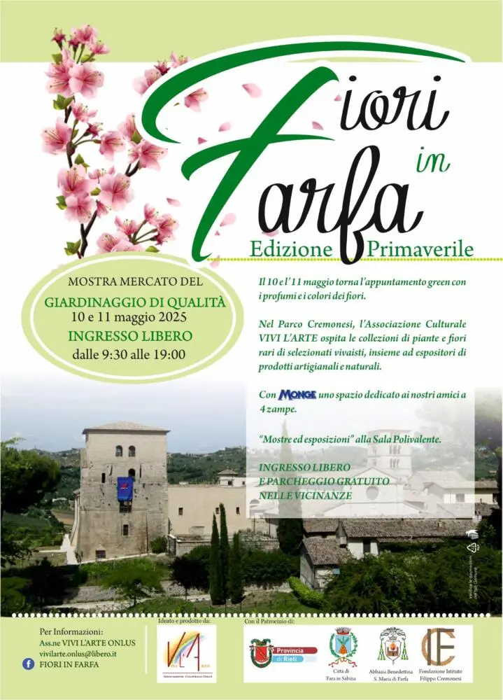 FIORI IN FARFA –  MOSTRA MERCATO DEL GIARDINAGGIO DI QUALITA’ – Il 10 e  l’11 maggio torna l’appuntamento green con i profumi e i colori dei fiori all’Abbazia di Farfa.