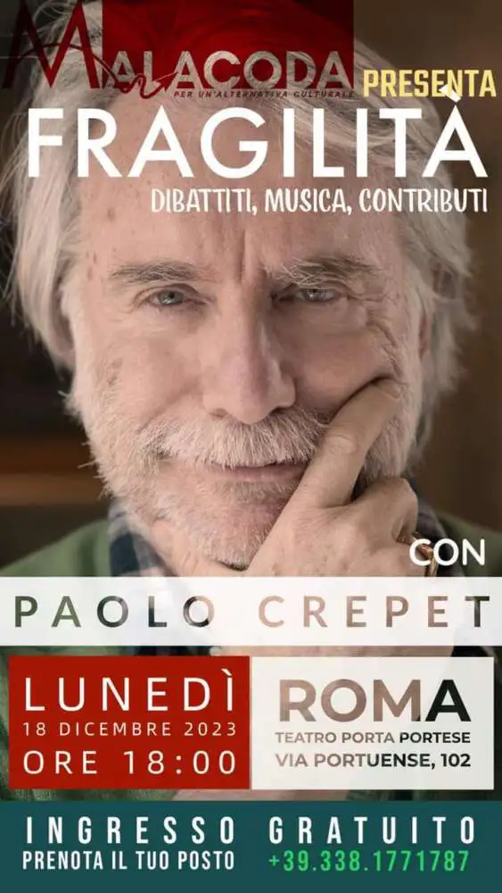 Lunedì 18 dicembre ore 18:00, al Teatro Porta Portese (Via Portuense, 102), MALACODA presenterà il numero della Rivista, completamente dedicato alla FRAGILITÀ, con un evento speciale che vedrà la partecipazione di Paolo Crepet. Il noto sociologo dialogherà con Pietro Folena, direttore editoriale della Rivista, per poi rispondere alle domande del pubblico.