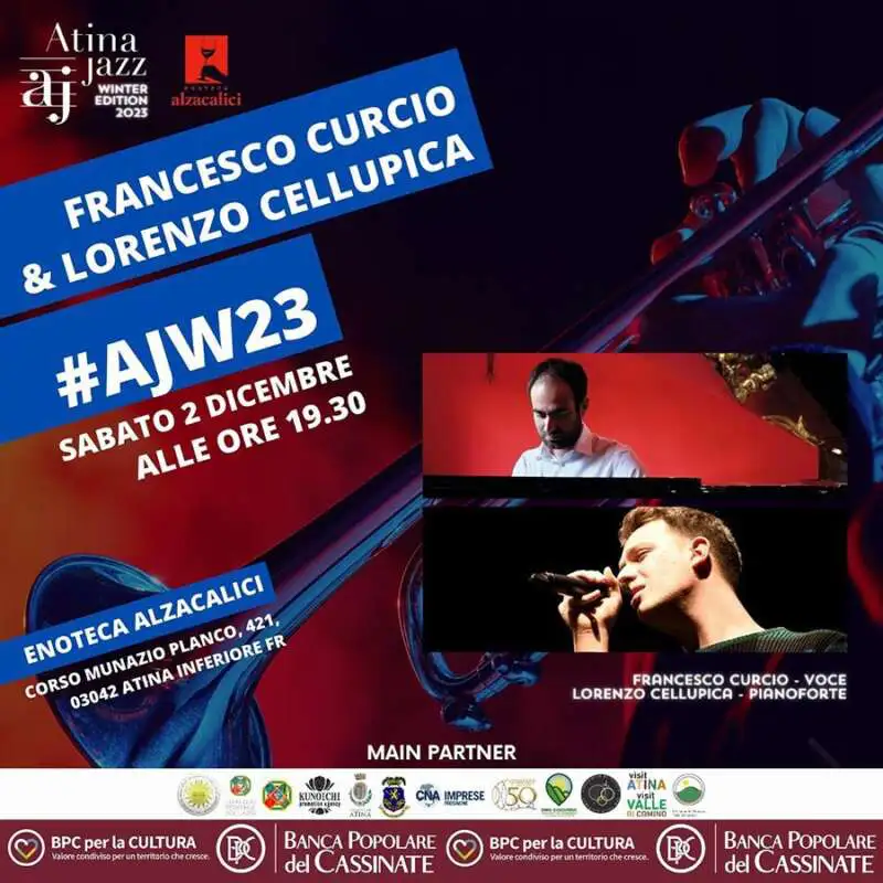 Sabato 2 Dicembre 2023 ad Atina per Atina Jazz Winter 2023 – Aperitivi in Jazz appuntamento con Francesco Curcio e Lorenzo Cellupica alle ore 19:30 presso l’Enoteca Alzacalici in Piazza Munazio Planco 421.