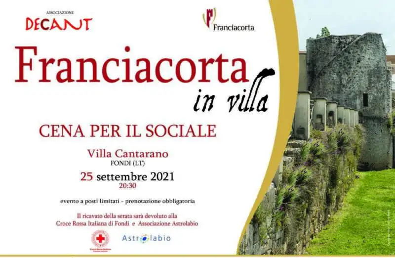 La manifestazione che vede da sempre la partecipazione e l’interesse di numerosi cultori del gusto, appassionati e operatori del settore è patrocinata dal Consorzio Franciacorta. Il contributo dei partecipanti alla cena servirà a supportare due progetti di solidarietà, l’incasso della serata sarà infatti interamente devoluto alle associazioni Croce Rossa Italiana sezione di Fondi e Astrolabio Cooperativa Sociale .