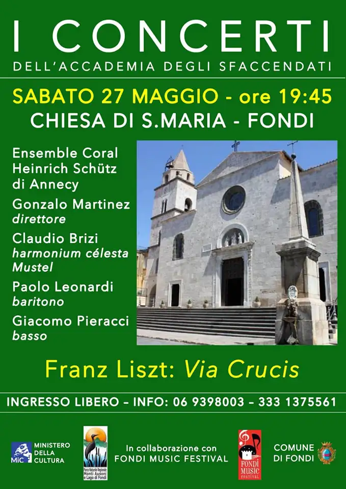 Sabato 27 maggio, alle ore 19:45, i 50 coristi francesi dell’Ensemble Coral Heinrich Schütz di Annecy, il direttore spagnolo Gonzalo Martinez, i giovani talentuosi solisti di canto italiani Paolo Leonardi, baritono, e Giacomo Pieracci, basso, con lo straordinario organista Claudio Brizi, che suonerà un rarissimo strumento storico di sua proprietà l’harmonium celesta Mustel del 1897, interpreteranno un capolavoro della musica sacra dell’Ottocento di rara esecuzione: la “Via Crucis” di Franz Liszt musicista e compositore dal profilo esemplarmente europeo, per la sua personalità non circoscrivibile in una specifica area geografica, per la sua vita nomade e per il suo internazionalismo culturale. Liszt sperimenta ogni aspetto della civiltà musicale europea: dal gregoriano ad arcaismi modali della sua Ungheria, dalle polifonie rinascimentali al corale protestante, dagli esemplari procedimenti bachiani al più acceso cromatismo romantico e con la “Via Crucis” realizza un’opera di grande originalità tra quelle del suo tempo in cui si fondono la sua ricerca della nuova armonia e la sua più intima religiosità.