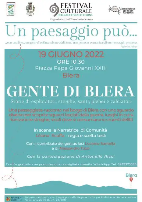 Un paese, per quanto piccolo, può custodire storie profonde e segreti senza tempo. Nel centro storico di Blera scopriremo certi squarci lasciati dalla guerra, un certo luogo in cui si riunivano le streghe, vicoli dove si consumarono cruenti delitti. Per scoprirlo, basterà affidarsi alla guida degli artigiani-narratori della storia e dell’immaginario.