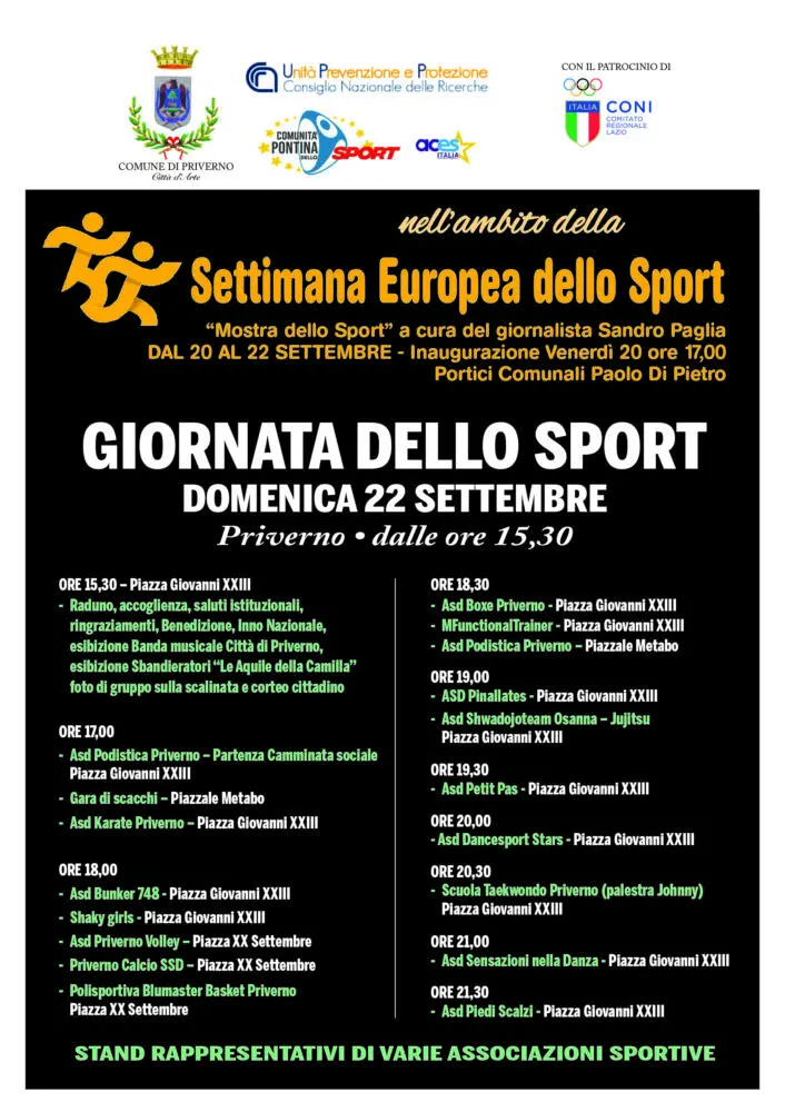 Nell’ambito della Settimana Europea dello Sport, la Città di Priverno, insignita del titolo di European Community of Sport 2024, ospita la Giornata dello Sport, un vero e proprio richiamo all’azione, che nuovamente, quest’anno, nella sua III edizione, crea l’occasione di stilare un ricco calendario di eventi, sportivi e non solo, promotori tanto della disciplina sportiva, quanto della parità e dell’uguaglianza, valori fondanti della nostra Comunità.