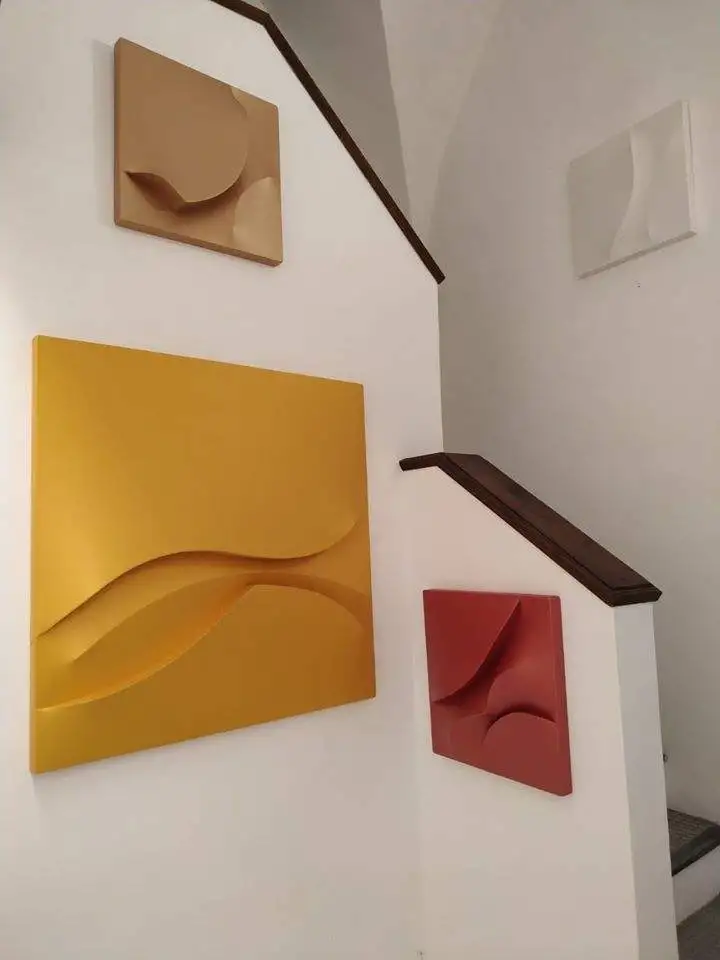 L’esposizione annovera 12 tele estroflesse monocrome (6 100cmx100cm e 6 50cmx50cm) e 5 ceramiche smaltate.