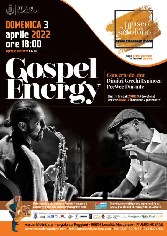 Domenica 3 aprile, alle ore 18:00 la suggestiva cornice del Museo del Saxofono, che ospita la piu’ grande collezione al mondo di questo amatissimo strumento, accoglierà la formazione in duo formata da Dimitri Grechi Espinoza al sax tenore e Paolo “Pee Wee” Durante a pianoforte e organo Hammond.