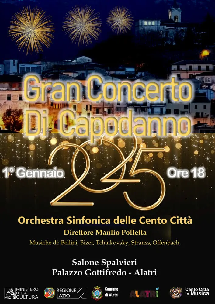 Il Giorno di Capodanno il salone Spalvieri all’interno del Palazzo Gottifredo ad Alatri, si colorerà di suoni e musica con l’Orchestra Sinfonica delle Cento Città Istituzione Orchestrale riconosciuta dal MIC diretta dal M° Manlio Polletta. L’Orchestra delle Cento Città costituita da alcuni tra i migliori strumentisti italiani provenienti da importanti teatri nazionali e orchestre prestigiose Ad oggi è una delle Orchestre più conosciute nel panorama artistico nazionale, grazie ai molteplici festival cui ha partecipato ed esibizioni musicali con direttori d’orchestra di fama internazionale e nazionale con cui ha collaborato.