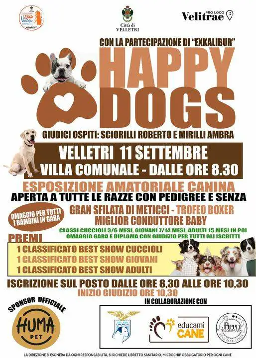 Domenica 11 settembre, nella Villa Comunale di Velletri Villa Ginnetti (viale Bruno Buozzi), si terrà l’esposizione amatoriale canina “Happy Dogs”.