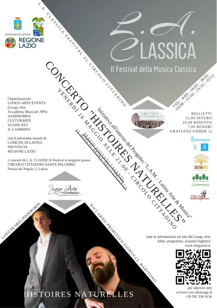 Venerdì 16 maggio, alle ore 21.00, presso il Circolo Cittadino Sante Palumbo, Piazza del Popolo 2, Latina, sarà una serata francese: in scena la voce Riccardo Primitivo Fiorucci con al pianoforte Luigi De Meo. Ascolteremo il celebre e magico “Claire de lune” di Debussy, le altrettanto celebri e uniche Gymnopedies di Satie e, una autentica chicca, le Histoires Naturelles di Ravel di cui è necessario spendere due parole. Immaginate un mondo in cui gli animali parlano, sognano, si innamorano, si arrabbiano e si annoiano proprio come noi. Con le sue Histoires naturelles, Maurice Ravel ci conduce in questo universo incantato, dove l’ironia si intreccia alla delicatezza, e la musica diventa racconto. Ispirato dai testi poetici di Jules Renard, Ravel dà voce a cinque creature, un pavone, una cavalletta, un cigno, un martin pescatore e una gallina, ognuna con la sua personalità, le sue manie, la sua poesia. Questa raccolta di mélodies è una vera gemma dell’impressionismo musicale francese: raffinata, evocativa e sorprendentemente umana. Ravel non si limita a descrivere, ma ci invita a guardare il mondo da un’altra prospettiva – quella della natura che ci osserva con occhio critico, tenero e un po’ beffardo. Le Histoires naturelles sono un piccolo capolavoro di teatralità, colore e introspezione.