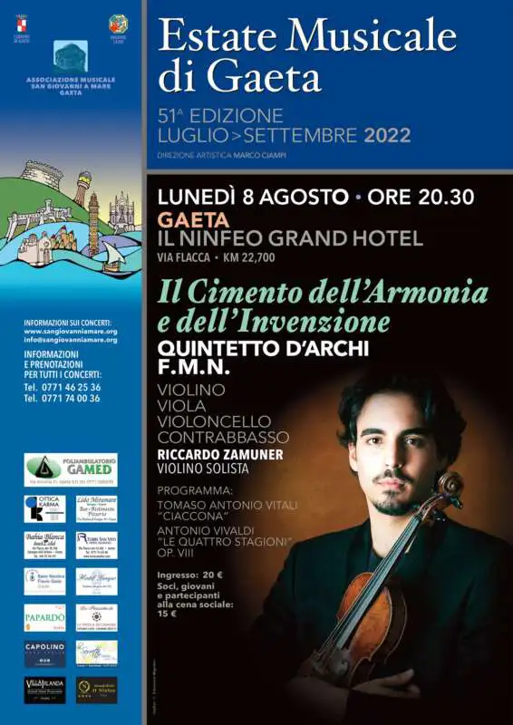 L’Associazione Musicale “San Giovanni a Mare”, associazione di concerti e di promozione della vita musicale, nasce a Gaeta nel giugno del 1971. A fondarla è un gruppo di “amici della musica”, guidati dalla Prof.ssa Idea Aletta, dall’Ing. Domenico Simeone, dalla Dott.ssa Claudia Rinonapoli Piccirillo, dalla Prof.ssa Vera Liguori Mignano, che si propongono di dar vita a stagioni concertistiche di alto livello, a festival musicali che – d’inverno e soprattutto d’estate – fanno di Gaeta un punto di riferimento, un polo di attrazione culturale oltre che turistica.