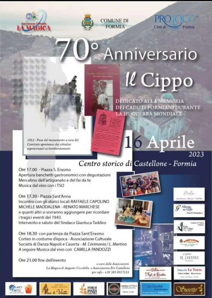 Domenica 16 aprile l’associazione LA MAGICA e l’associazione PRO CASTELLONE in occasione del 70esimo anniversario dell’inaugurazione del cippo alla memoria dedicato ai caduti Formiani della seconda guerra mondiale organizzano una giornata ricordo.